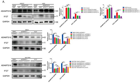TTTT; ShADAMTS16-2, CCGGGAGTATAAGTCTTGCTTACGGCATACTCGAGTATGCCGTAAGCAAGACTTATACTCTTTTTT; siIFI27-1, CTGCAGAGAAGAGAACCAT; siIFI27-2, TCTGGCTCTGCCGTAGTTT. The sequences were inserted into pLKO.1-TRC-copGFP-2A-PURO (WZ Biosciences, Jinan, China). The amplified vectors were transformed into competent Escherichia coli DH5α cells (TSINGKE, Beijing, China) and confirmed by sequencing. The vectors were isolated sequentially using an Endo-Free Plasmid Maxi Kit (Omega, Norcross, GA, USA). Transient transfection was performed using Lipofectamine 3000 reagent (Invitrogen, Carlsbad, CA, USA) according to the manufacturer’s instructions. For stable cell lines, 2 × 105 GC cells were seeded on 6-well plates. When the cells had grown to 70–80% confluence, we replaced with fresh Opti-MEM (Invitrogen, Carlsbad, CA, USA) medium without FBS and used the ADAMTS16 or shADAMTS16 virus to infect the cells. After incubating for 72 h, the stable cells were obtained by puromycin screening. HGC27 and AGS were used for ADAMTS16 overexpression and IFI27 knockdown, whereas MKN-1 and SGC7901 were used for ADAMTS16 knockdown and IFI27 overexpression.
