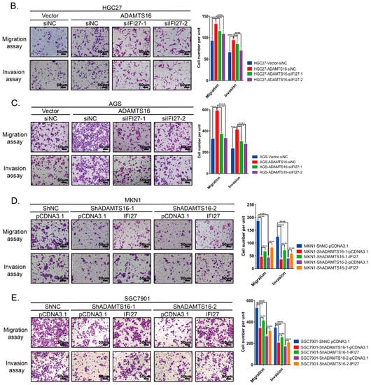To further investigate the role of IFI27 in ADAMTS16-mediated promotion of GC cell growth and invasion, we knocked down IFI27 in HGC27 and AGS cells stably overexpressing ADAMTS16 and induced IFI27 overexpression in ADAMTS16 knockdown MKN1 and SGC7901 cells. The expression of IFI27 was validated by using western blotting (Figure 4A). As a consequence, migration and invasion assays were performed to further investigate the effect of IFI27 expression on GC cell. IFI27 knockdown inhibited the migration and invasion of HGC27 (migration: ADAMTS16-siNC vs. ADAMTS16-siIFI27-1, p < 0.0001; ADAMTS16-siNC vs. ADAMTS16-siIFI27-2, p < 0.0001; invasion: ADAMTS16-siNC vs. ADAMTS16-siIFI27-1, p < 0.001; ADAMTS16-siNC vs. ADAMTS16-siIFI27-2, p < 0.0001; Figure 4B) and AGS cells (migration and invasion: ADAMTS16-siNC vs. ADAMTS16-siIFI27-1, ADAMTS16-siNC vs. ADAMTS16-siIFI27-2, both p < 0.0001; Figure 4C). On the contrary, IFI27 overexpression promoted the migration and invasion of MKN1 and SGC7901 cells (ShADAMTS16-1-pCDNA3.1 vs. ShADAMTS16-1-IFI27, both p < 0.0001; ShADAMTS16-2-pCDNA3.1 vs. ShADAMTS16-2-IFI27, both p < 0.0001; Figure 4D,E). As expected, colony formation assay showed that knockdown of IFI27 significantly reversed colony formation ability of ADAMTS16 stable cell lines silencing IFI27 compared with control group cells (ADAMTS16-siNC vs. ADAMTS16-siIFI27-1; ADAMTS16-siNC vs. ADAMTS16-siIFI27-2; both p < 0.001, Figure 4F). Meanwhile, overexpression of IFI27 significantly rescued colony formation ability of silencing ADAMTS16 stable cell lines MKN1 and SGC7901 (ShADAMTS16-1-pCDNA3.1 vs. ShADAMTS16-1-IFI27; ShADAMTS16-2-pCDNA3.1 vs. ShADAMTS16-2-IFI27; both p < 0.001; Figure 4G).