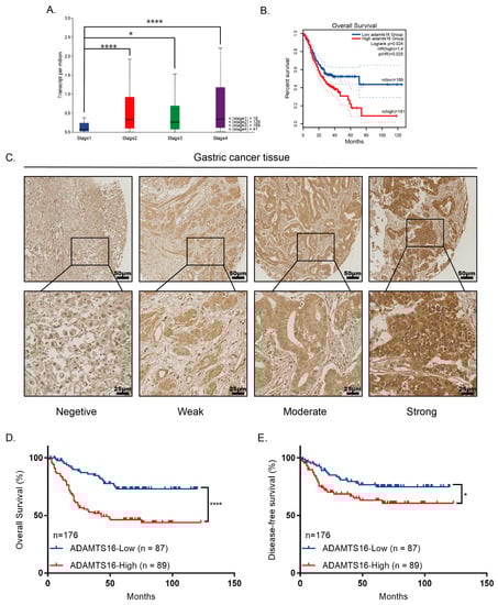 ADAMTS16 is upregulated in gastric cancer (GC) and is associated with a poor prognosis. (A) ADAMTS16 mRNA expression in advanced-stage GC tissue was higher than in early-stage GC tissue in TCGA. (B) GEPIA2 Kaplan–Meier plot of the effect of ADAMTS16 gene expression on GC patient survival. (C) Representative immunohistochemical staining image for ADAMTS16 protein expression level in GC. (D,E) Kaplan–Meier survival curves of GC patients on ADAMTS16 expression. Scale bar: 25 µm (C up), 50 µm (C down). The data are shown as means ± standard deviations. * p < 0.05, **** p < 0.0001.