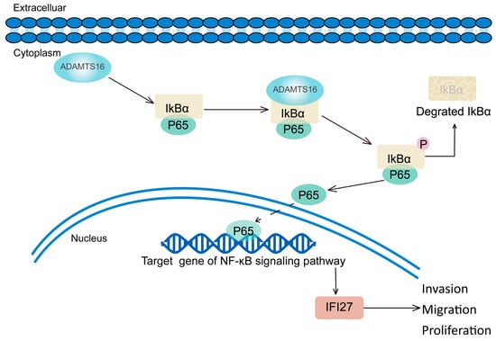 We further investigated the target genes of ADAMTS16 in GC cell lines and its downstream molecular pathway. RNA-Seq and bioinformatics analyses of AGS-vector/ADAMTS16 cells showed that IFI27 was the most significant of the top 20 most differentially expressed genes. IFI27 (interferon alpha inducible protein 27), a member of the FAM14 family, is stably induced by interferon [], and has been reported to regulate biological processes in numerous cancers [,,]. In GC, Deng R et al. illustrated that IFI27 regulates tumor immunity via the canonical Wnt/β-catenin signaling pathway []. However, we revealed that IFI27 is regulated by ADAMTS16 in GC. Furthermore, the specific NF-κB pathway inhibitor BAY11-7082 suppressed IFI27 expression, indicating that the activation of the NF-κB/IFI27 signaling cascade is regulated by ADAMTS16. In previous studies, P65 is associated with the occurrence and development of various tumors [,,,]. The binding site between P65 and IFI27 was confirmed in our research. Subsequently, we found that IFI27 overexpression restored the invasion, migration, and proliferation abilities of GC cells to a certain extent. Therefore, we have reason to believe that ADAMTS16 promotes cell migration, invasion, and growth through the NF-κB/IFI27 axis (Figure 6). Accordingly, ADAMTS16 may function as a pro-tumor factor in GC development and progression in vivo, such that ADAMTS16 stimulated tumor growth in the xenotransplantation model in this study.