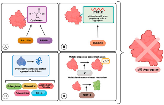 Strategies to target p53 aggregation as anticancer candidates. (A) Thiol alkylating agents targeting mutp53 cysteines. (B) Designed peptides that bind in a complementary way to regions of p53 with a greater propensity to aggregate. (C) Miscellaneous compounds with anti-protein aggregation properties previously tested in neurodegenerative diseases. (D) Compounds with metallochaperone- or molecular-chaperone-based mechanisms.
