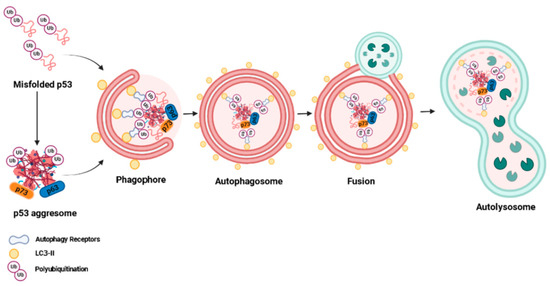 Aggregation-prone mutp53 mediates the sequestration of various tumor suppressors, including wtp53, p63, and p73 [22], in intracellular aggregates that are too large to fit in the gated channels of the proteasome, preventing their degradation by the proteasome [145]. These large cytoplasmic inclusion bodies, which act as disposal devices that will eventually be degraded via autophagy, are called aggresomes [146]. The presence of mutp53 in these cytosolic structures is important evidence that autophagy is a key route for mutp53 aggresome degradation. Specific autophagy of aggresomes or misfolded proteins is known as aggrephagy [39] (Figure 2).