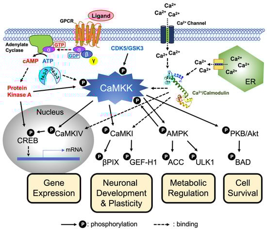 CaMKK-mediated cellular signaling. Increasing intracellular Ca2+ concentration triggers the Ca2+/CaM-dependent activation of CaMKK, resulting in the activation of the downstream protein kinases including CaM-kinase I (CaMKI), CaM-kinase IV (CaMKIV), AMPK (5′AMP-kinase), and protein kinase B (PKB/Akt) through the phosphorylation of their activation-loop Thr residues. The CaMKK-mediated phosphorylation cascade is involved in a wide variety of physiological functions including transcriptional activation, neuronal development and plasticity, metabolic regulation, and cell survival. CaMKK is regulated by multiple cellular signaling cascades, such as intracellular Ca2+, cAMP/PKA signaling, 14-3-3-binding, feedback phosphorylation by activated AMPK, and cyclin-dependent protein kinase 5 (CDK5)/glycogen synthase kinase 3 (GSK3)-mediated phosphorylation. Modified from Ref. [68]. Cream yellow boxes indicate physiological functions of CaMKK-mediated signaling pathways. CREB; cAMP-response element binding protein, βPIX; Pax-interacting exchange factor β, GEF-H1; guanine nucleotide exchange factor H1, ACC; acetyl-CoA carboxylase, ULK1; Unc51-like-kinase 1, and BAD; BCL2 associated agonist of cell death.