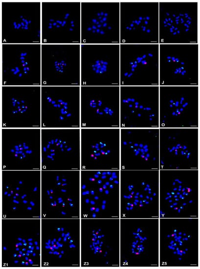 Among the diploids, high interspecific polymorphisms of rDNA loci number and localisation were observed, and nine patterns of rDNA loci chromosomal organisation were distinguished (Figure 1F–Z5; Table 1). The number of 35S rDNA loci ranged from one to three (Figure 1), whereas the number of 5S rDNA loci was from one to two per haploid chromosome set in diploids (Figure 1); however, most often (10 species) one locus of 35S rDNA and one locus of 5S rDNA was observed (Table 1; Figure 1F–I,N–Q,S,U). The locus of 35S rDNA in the interstitial chromosomal position was most often observed (14 diploid species; Figure 1F,H–Q,S–U). The subterminal position of 35S rDNA loci was observed in three diploid species (Figure 1G,R,V). In karyotypes of eight diploids, the locus of 5S rDNA was observed exclusively in the subterminal position (Figure 1H,N–Q,S–U). The interstitial localisation of the 5S rDNA locus/loci was found in seven species (Figure 1F,G,I–L,V), whereas two species had both interstitial and subterminal loci of 5S rDNA (Figure 1M,R). Most analysed diploids had 5S and 35S rDNA loci in different chromosome pairs (Figure 1F–L,N–Q,S–U). In karyotypes of three species (O. megataphros, O. alba subsp. laconica and O. crista-galli), one or two chromosomes bearing both 35S and 5S rDNA loci were observed (Figure 1L,M,V).