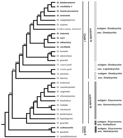 The genus Onobrychis Mill. (Fabaceae) comprises approximately 162 perennial and annual species distributed in temperate zones of North America, the Middle East and Europe [,]. The majority of Onobrychis species are restricted to Iran, Anatolia and Caucasus, suggesting that these areas were the centre of diversity of the genus []. Sirjaev [], based on floral characteristics, divided the genus into two subgenera: Onobrychis Mill (including sections Onobrychis, Dendrobrychis DC., Lophobrychis Hand.-Mazt., Hemicyclobrychis (Širj.) Rech.f.) and Sisyrosema Bunge (including sections Anthyllium Nab., Afghanicae Širj., Heliobrychis Bunge ex Boiss., Hymenobrychis DC.). Recent molecular phylogenetic analyses indicate that Onobrychis is a monophyletic taxon and can be further divided into two main evolutionary lineages, each corresponding to the redefined subgenus Onobrychis and Sisyrosema [].