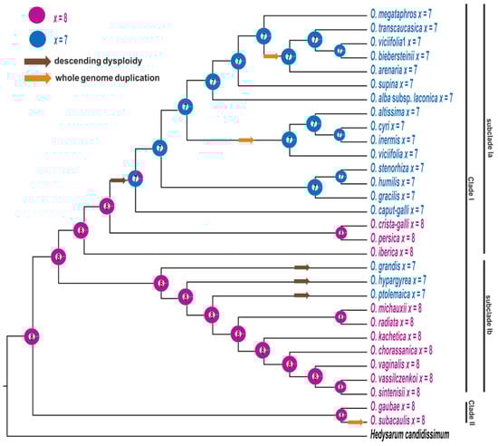 The basic chromosome number x = 8 was recovered as the ancestral state for all studied Onobrychis species and as the ancestral state for all distinguished clades and subclades (Figure 3). Although in subclade Ib most of the species had x = 8, three events of descending dysploidy (from x = 8 to x = 7) were inferred (in O. ptolemaica, O. hypargyrea and O. grandis evolutionary lineages). In subclade Ia, only three diploid species had x = 8 (O. crista-galli, O. persica, O. iberica), while the remaining species had x = 7, and only one event of descending dysploidy was retrieved. Three events of chromosome number duplication were reconstructed: (i) in the evolutionary lineage of O. subacaulis (clade II); (ii) for common ancestor of O. arenaria, O. transcaucasia and O. bibersteinii and one accession of O. viciifolia and (iii) for common ancestor of O. altissima, O. cyri, O. inermis and the second accession of O. viciifolia (Figure 3 and Figure S1).