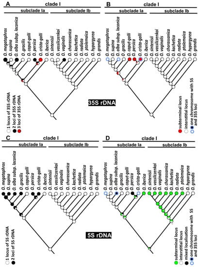 The number and localisation of rDNA loci were analysed using FISH for diploids from clade I. The obtained data were mapped on the ML phylogenetic tree using the maximum likelihood reconstruction methods. The analyses resulted in the reconstruction of one locus of 35S rDNA in the interstitial position in the chromosome and one locus of 5S rDNA as an ancestral state of clade I and both distinguished subclades Ia and Ib (Figure 4). Unlike for the 35S rDNA locus, the ancestral state of chromosomal localisation of the 5S rDNA loci was ambiguously retrieved. The ancestral state of 35S rDNA locus number and localisation was observed in most species in the Ib clade. Gain of the 35S rDNA locus accompanied speciation of only one species, O. vaginalis (Figure 4A). In subclade Ib, all species also showed an ancestral state, one locus of 5S rDNA. In karyotypes of most species from this subclade, this locus was in the subterminal position (Figure 4C). The analyses suggested one or two repositioning events of 5S rDNA loci during the evolution of the subclade Ib (O. hypargyrea and O. grandis; Figure 4B). One interstitial locus of 35S rDNA and one locus of 5S rDNA were also reconstructed as an ancestral state for subclade Ia. However, the patterns of rDNA loci evolution were more complicated in this subclade. The ancestral state, one locus of 35S rDNA was observed in four out of eight species (O. iberica, O. supina, O. caput-gali and O. gracilis; Figure 4C). The evolution of the remaining species was accompanied by a gain of one locus (O. persica, O. alba subsp. laconica and O. megataphorus) or two loci (O. crista-galli) of 35S rDNA (Figure 4A). The diversification of these species was also accompanied by at least two events of 35S rDNA loci repositioning from the interstitial (ancestral state) to the subterminal localisation (Figure 4B). The ancestral number, one locus of 5S rDNA, was present only in the karyotype of two species, O. iberica and O. caput-galli from subclade Ia. The gain of 5S rDNA loci was retrieved for the common ancestor of most diploids from subclade Ia (except O. iberica, which has the ancestral number of loci), followed by the loss of 5S rDNA loci during speciation of O. caput-galli (Figure 4C). Additionally, repositioning of 5S rDNA locus may also be suggested to accompany the speciation of O. iberica (species with subterminal 5S rDNA locus) or the evolution of all other species from subclade Ia (at least one locus of 5S rDNA in interstitial localisation). Moreover, three diploids (O. megataphros, O. crista-galli and O. alba subsp. laconica) that had duplicated (or triplicated) numbers of both rDNA loci included in their karyotypes a chromosome bearing both 35S and 5S rDNA loci (Figure 4).