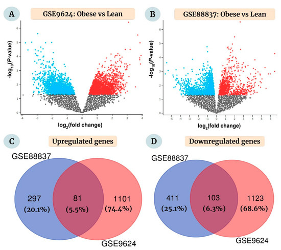 For the chosen datasets, the number of upregulated DEGs was 1182 (GSE9624, obese vs. lean) and 378 (GSE88837, obese vs. lean), whereas the number of downregulated DEGs was 1226 (GSE9624, obese vs. lean) and 514 (GSE88837, obese vs. lean), respectively. Figure 2A,B depicts the significant DEGs in the two datasets. Venn diagrams were then constructed using the Venn diagram tool available at http://bioinformatics.psb.ugent.be/webtools/Venn/ (accessed on 11 July 2022) to identify the overlapping DEGs between the two groups. Eighty-one upregulated (Figure 2C) and 103 downregulated DEGs (Figure 2D) were identified as overlapping between the two datasets, which were selected for further analysis.