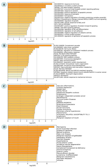 Furthermore, the disease–gene interaction from DisGeNet revealed that the upregulated genes were involved in vascular inflammations, unipolar depression, weight gain, kidney failure, and adolescent idiopathic scoliosis (Figure 3C). In contrast, the downregulated genes were significantly associated with meningioma, acute myocardial infarction, diseases of the capillaries, Behçet syndrome, and Fatty Liver disease (Figure 3D). The functional enrichment in terms of Biological Process, Molecular Function, and Cellular Components is given in Supplementary Table S1.
