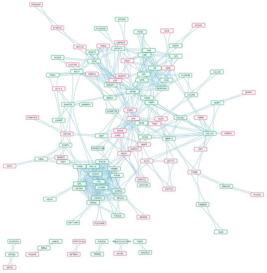The protein–protein interaction (PPI) network of overlapping DEGs between obese and lean children. The red-purple border indicates the upregulated genes, and the green border shows the downregulated overlapping genes. There were 44 upregulated and 71 downregulated overlapping genes in the PPI network with 552 paired interactions.