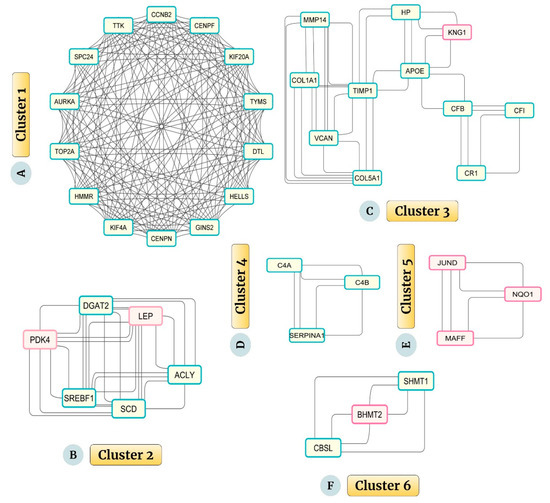 (A–F) The top six significant clusters were extracted from the PPI network through the MCODE plug-in. The red-purple border indicates the upregulated genes, and the green wall shows the downregulated overlapping genes. (A) Cluster 1 (KIF20A, AURKA, HMMR, TTK, TOP2A, CENPN, DTL, HELLS, CCNB2, GINS2, SPC24, KIF4A, CENPF, TYMS): 14 nodes, 170 edges, and score: 13.077, (B) Cluster 2 (LEP, SREBF1, ACLY, PDK4, SCD, DGAT2): 6 nodes, 28 edges, and score: 5.600, (C) Cluster 3 (CR1, HP, KNG1, TIMP1, APOE, COL1A1, CFI, VCAN, CFB, MMP14, COL5A1): 11 nodes, 38 edges, and score: 3.800, (D) Cluster 4 (SERPINA1, C4A, C4B): 3 nodes, 6 edges, and score: 3.000, (E) Cluster 5 (JUND, MAFF, NQO1): 3 nodes, 6 edges, and score: 3.000, (F) Cluster 6 (SHMT1, BHMT2, CBSL): 3 nodes, 6 edges, and score: 3.000.