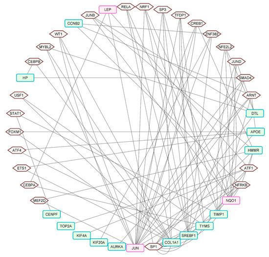 The hub gene-transcription factor (TF) network. The hexagons with brown outlines indicate the TFs, and the round, rectangular nodes are the hub genes, those upregulated marked with the red-purple border and those downregulated with the green border. The network had 17 hub genes and 24 TFs, with 90 hub gene–TF interaction pairs.