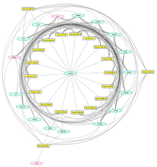 The predicted miRNA-hub gene network shows the interaction between the top 20 miRNA and the hub genes (mRNAs). The hexagons indicate the hub genes, those upregulated marked in the red-purple border and those downregulated in the green border. The round, rectangular nodes are the predicted targeting miRNA. The network contains 19 genes and the top 20 miRNA, with 228 pairs of interactions between them.