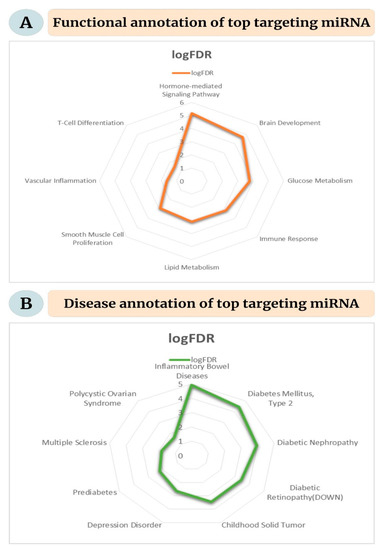The top five targeting miRNA according to a maximum number of interaction pairs were miR-34a-5p, miR-16-5p, miR-124-3p, miR-103a-3p, and miR-107. The functional analysis yielded eight items for cell specificity, four for the clusters, 262 for disease, four for miRNA family, 56 functions, and four for tissue specificity. All items were sorted according to the statistical significance per the false discovery rate (FDR), and relevant functions and disease categories were visualized. The selected functional annotations included glucose and lipid metabolism, brain development, immune response, vascular inflammation, smooth muscle cell proliferation, hormone-mediated signaling pathway, and T-cell differentiation (Figure 8A). The significant disease categories included inflammatory bowel disease, type 2 diabetes mellitus, diabetic nephropathy and retinopathy, solid childhood tumor, prediabetes, depression, polycystic ovarian syndrome, and multiple sclerosis (Figure 8B).