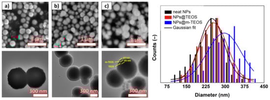 SEM/TEM images of the (a) neat NPs, (b) NPs@TEOS and (c) NPs@m-TEOS, and the particle-size distributions for the corresponding nano-species.
