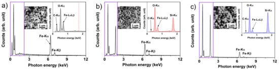 EDX spectra were recorded to discern the elemental composition of the nano-powders, and to detect any impurities stemming from the precursors. As detailed in Figure 2, the neat NPs were composed of the expected elements, i.e., Fe and O. A small amount of C was attributed to the carbon tape that served as a support for mounting the samples. As anticipated, the TEOS and m-TEOS-coated NPs exhibited a remarkable peak at 1.74 keV related to the binding energy of Si. Although the EDX technique is usually applied for qualitative analysis of materials, the NPs@m-TEOS exhibited somewhat stronger signals for silicon and oxygen (26.3 and 44.0 wt%), compared to those of the NPs@TEOS (15.9 and 32.9 wt%), indicating the presence of a thicker silica shell; this finding corresponded to the TEM observations (Figure 1b,c). To conclude, the EDX spectra evinced the success of the modification, and further proved that the samples were free of impurities.