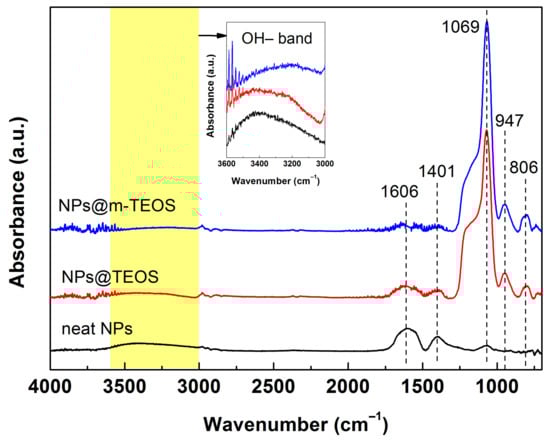 FTIR spectra for the neat NPs, NPs@TEOS and NPs@m-TEOS particles with denoted characteristic wavenumbers.