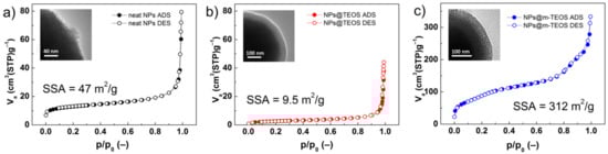 Nitrogen adsorption/desorption (solid/open symbols) isotherms for the (a) neat NPs, (b) NPs@TEOS and (c) NPs@m-TEOS; the insets highlight differences in surface topology.