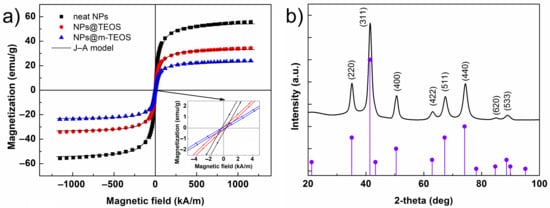 The isothermal magnetic loops of the samples are displayed in Figure 5a. As can be seen, neither applying the TEOS coating, nor the formation of the mesoporous structure affected the intrinsic magnetic properties of the materials, and every VSM curve showed a typical sigmoidal shape, as observed for other magnetite-based materials, e.g., PS/Fe3O4 hybrids []. In order to determine the saturation magnetization (MS) of the NPs, the data was fitted by applying the Jiles–Atherton (J–A) model [], that can be read as follows: