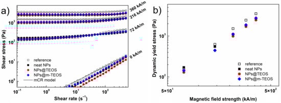 Under low magnetic fields (below 72 kA/m), the MR fluid supplemented with neat NPs exhibited higher shear stresses than the reference. Based on the empirical model reported by Anupama et al. [], such rise in shear stress was initiated by a sharp increase in the magnetization of the NPs (Figure 6a), which in turn, supported interaction between the binary particles. Considering the dimensions of the NPs, the typical gap-filling effect was most likely limited; therefore, a lesser extent of enhancement was achieved than reported for nano-sized (<100 nm) additives []. The analogues supplemented with NPs@TEOS and NPs@m-TEOS demonstrated shear stress values comparable to the reference fluid.