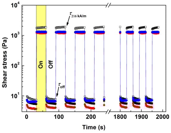 Testing under dynamic magnetic fields was performed to simulate the operation of real-world MR devices []. Figure 7 displays the results of the repeatability experiment under 216 kA/m, where the shear stress abruptly increased or decreased once exposed to the external magnetic field or after it was switched off, respectively. This phenomenon occurred within numerous loading cycles, evidencing the reversible formation of particle chains. It is noteworthy that the MR fluids supplemented with the NPs were able to stabilize the desired on-state values much faster than the reference fluid; in this context, better control over rheological properties is highly beneficial for practical applications. The performance of the MR fluids was compared next by applying the “MR effect” formalism as given by the following equation: