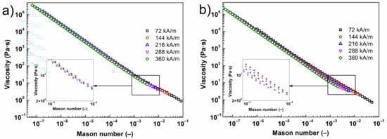 To better understand the behavior of the investigated MR fluids, viscosity was plotted against the dimensionless Mason number, Mn. The Mn groups together the magnetostatic and hydrodynamic forces as two dominant influences on an MR fluid under a steady flow [], and is formulated as: