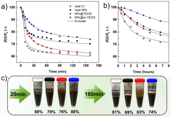 As mentioned earlier, a compelling reason for utilizing NP additives in MR fluids is their capacity to improve the sedimentation profile. In order to evaluate such enhancing effects, recorded images were translated into sedimentation curves, as displayed in Figure 9. The reference MR fluid presented the worst sedimentation profile due to the lack of additives acting as physical barriers, in conjunction with possible aggregation of the CI particles []. An unexpected behavior was observed for samples containing the neat NPs and NPs@TEOS, respectively. The former gave rise to a superior sedimentation curve, although the neat NPs were presumed to have a higher bulk density compared to their TEOS-coated analogues. This phenomenon could be rationalized by recalling the given surface effects; the neat NPs possessed a rough surface (Figure 1a) while their TEOS-coated analogues had a smooth finish and lower SSA, which diminished friction forces and facilitated sedimentation as a consequence. Another notable aspect was that the NPs@TEOS particles were not attached to the CI particles, instead they remained in the supernatant throughout the sedimentation process (see the digital photo in Figure 9). This confirmed the hypothesis that the NPs@TEOS material acted as a lubricant []. The MR suspension supplemented with NPs@m-TEOS showed the best sedimentation profile for the following reasons: (i) it exerted a physical barrier effect; (ii) frictional forces were heightened; (iii) hydrodynamic volume increased; and (iv) its density was lower, thus, it demonstrated greater buoyancy than the counterparts with compact coatings [,,]. These results correlated well with the off-state MR data (Figure 6a). For further analysis, the sedimentation process was simulated by parametric models. In this context, the sedimentation behavior of MR fluids is usually approximated by an exponential decay law, as follows: