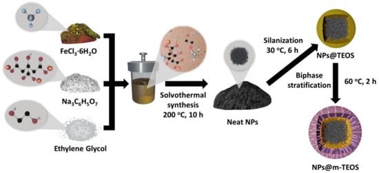 The TEOS-coated NPs were encapsulated in mesoporous silica by applying a method of one-pot biphase stratification [,], with CTAB as the surfactant template, resulting in the NPs@m-TEOS product. In this reaction, 0.2 g of NPs@TEOS was dispersed in 30 mL of water, 2.0 g of CTAB and 72 mg of triethanolamine, and the mixture was gently stirred (200 rpm) at 60 °C for 2 h. Subsequently, 10 mL of TEOS dissolved in cyclohexane (10 v/v%) was carefully added (1 mL/min) into the mixture with the aid of a programmable syringe pump (NE-1000, New Era Pump Systems, Farmingdale, NY, USA), at a constant temperature of 60 °C and a low stirring speed (150 rpm). Although removal of CTAB by calcination is usually possible [] at 550 °C, in the case of magnetic substrates, such a process causes significant deterioration in magnetic properties. Therefore, CTAB was removed by dispersing the NPs in 120 mL of ethanol that contained 80 mg of ammonium nitrate []. The final step of cleaning involved washing in water (4 × 50 mL, each) and ethanol (4 × 50 mL, each) in a similar manner to that described above. The complete procedure for synthesis is illustrated in Figure 10.