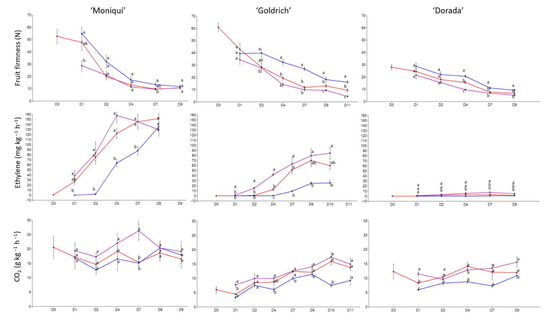 Evolution of fruit firmness by compression (N), ethylene emission (mg kg−1 h−1) and CO2 emission (g kg−1 h−1) of apricot cultivars assayed during the shelf-life period at 20 °C for control (red color), 1-MCP (blue color), and Ethrel treatments (purple color). Letters show significant differences in the Tukey test (p-value < 0.05).