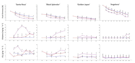 Evolution of fruit firmness by compression (N), ethylene emission (mg kg−1 h−1) and CO2 emission (g kg−1 h−1) of Japanese plum cultivars assayed during the shelf-life period at 20 °C for control (red color), 1-MCP (blue color), and Ethrel treatments (purple color). Letters show significant differences in the Tukey test (p-value < 0.05).