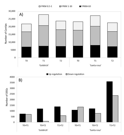 In the de novo transcriptome validation, the assemblies of ‘Goldrich’ and ‘Santa Rosa’ were aligned to Prunus armeniaca (‘Chuanzhihong’) and Prunus salicina (‘Zhongli’), respectively, reaching a high mapped reads coincidence of 88.44% and 97.96% (Table 4).