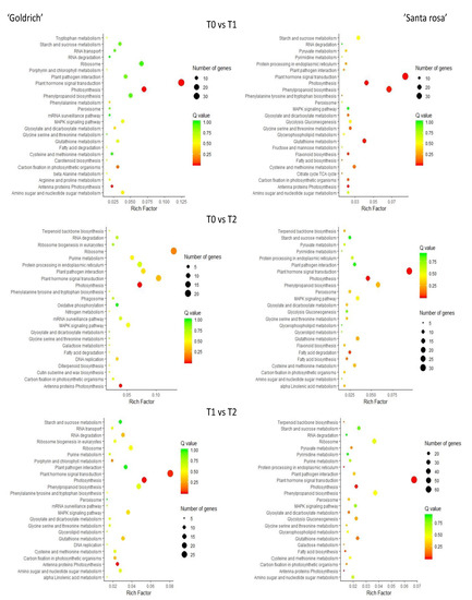 Metabolic pathway analysis based on DEGs filtering (−1 > log2FC > 1; p-value < 0.005) for T0 vs. T1, T0 vs. T2, and T1 vs. T2 comparison in apricot ‘Goldrich’ and Japanese plum ‘Santa Rosa’. Advanced bubble chart shows enrichment of DEGs to each signaling pathway. The Y-axis label represents the pathway, and the X-axis label represents the rich factor. The size and color of the bubble represent the amount of DEGs enriched in pathway and enrichment significance, respectively.