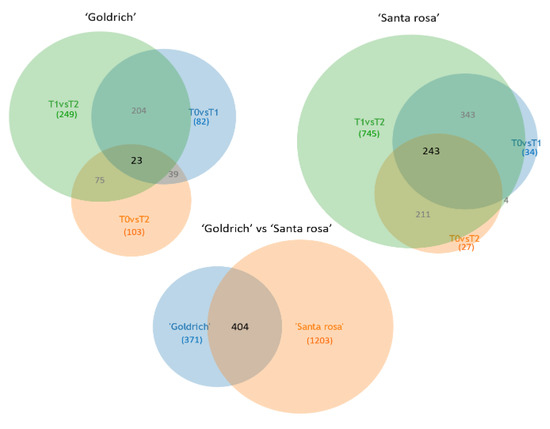 Venn diagrams of genes functionally annotated between treatment comparisons (T0 vs. T1, T0 vs. T1, and T1 vs. T2) and between apricot ‘Goldrich’ and Japanese plum ‘Santa Rosa’ after filtering (DEGs, −1 > log2FC > 1; p-value < 0.005).