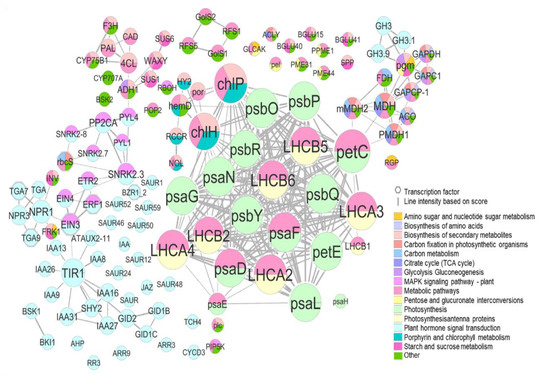 Moreover, a third tiny cluster was connected to photosynthesis and photosynthetic carbon fixation through petC (cytochrome b6-f complex iron-sulfur subunit), which was in turn upregulated by 1-MCP (Figure 6 and Figure 7, Table S6). This third cluster contains proteins such as mMDH2, MDH, PMDH1, ACO, FDH, GAPCP-1, GAPC1, GAPDH, and pgm, which are key proteins involved in many pathways, specially phosphoglucomutase (pgm) which interconnects pathways such as amino sugar and nucleotide sugar metabolism, pentose and glucuronate interconversions or glycolysis, and gluconeogenesis.