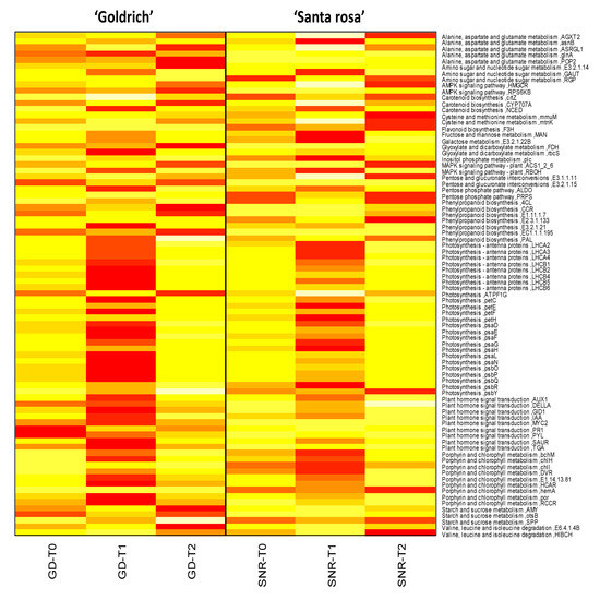 According to the pathways involved in each treatment comparison and species, DEGs were linked to different metabolic pathways (Figure 4). Plant hormone signal transduction and photosynthesis were the most significant pathways for any treatment comparison, which is common in ‘Goldrich’ and ‘Santa Rosa’.