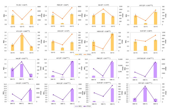 RNAseq validation using NRQ (Normalized Relative Quantification) by RT-qPCR and FPKM (Fragment per Kilobase Million) of 16 genes using three biological and two technical replicates. The orange color shows 8 genes validated in apricot ‘Goldrich’: polygalacturonase (PG), pectinesterase (PME), auxin-responsive protein (IAA), beta-carotene 3-hydroxylase (CRTZ), GDP-L-galactose phosphorylase (VTC2_5), UDP-glucuronate decarboxylase (UXS1), 3-hydroxyisobutyryl-coa hydrolase (HIBCH), and sucrose synthase (SUSY); while purple color shows 8 genes validated in Japanese plum ‘Santa Rosa’: auxin-responsive protein (IAA), pectinesterase (PECT), 1-aminocyclopropane-1-carboxylate synthase (ACS), ferredoxin (PET’), flavonoid 3’-monooxygenase (CYP75B1), chalcone synthase (CHS), inositol phosphate metabolism (INO1), and sucrose synthase (SUSY). In brackets, Pearson correlation is shown (p-value < * 0.05, ** 0.01, *** 0.005). PME, IAA, and SUSY were exclusively designed using sequences of ‘Goldrich’ and ‘Santa Rosa’ independently.