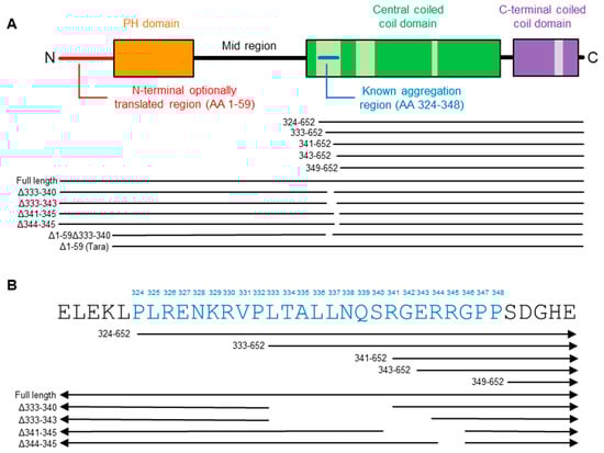 Initial bioinformatic analyses of TRIOBP-1 suggested that its aggregation was likely driven by its PH domain, which contains several stretches of amino acids that may make it prone to aggregation. However, deletion of the PH domain from plasmid constructs encoding full-length mouse Triobp-1 did not prevent the proteins they encoded from aggregating [9]. Instead, studies using human TRIOBP-1 constructs revealed that a site within the CCC domain was likely to be responsible [15]. Specifically, the expression of amino acids (AA) 324-652 of TRIOBP-1, including all the structured C-terminal half of the protein except for one coiled-coil of the CCC domain, formed aggregates resembling the full-length protein. In contrast, a construct encoding AA 349-652, containing all of the same coiled-coils but lacking one unstructured loop region, did not form visible aggregates and distributed in the cytoplasm [15]. In support of this, while a construct consisting of AA 190-652 of TRIOBP-1 (the entire protein excepting the optionally translated region and PH domain) formed aggregates, an equivalent construct from which amino acids 324-348 (Figure 1B) had been deleted did not [15]. It was therefore concluded that this 25 amino acid-long loop, or a subpart of it, was responsible for the aggregation of TRIOBP-1.