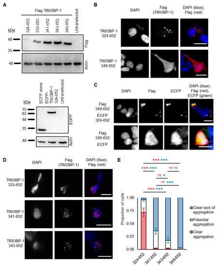 Testing aggregation of TRIOBP-1 using C-terminal fragments. (A) Western blots showing Flag-tagged TRIOBP-1 constructs (left) and ECFP or ECFP-fused TRIOBP-1 constructs (right) in HEK293 cell lysates. (B) A protein fragment containing amino acids (324-652) of TRIOBP-1 consistently forms aggregates, as expected. AA 349-652 of TRIOBP-1 consistently do not form aggregates, as expected. (C) When aggregating TRIOBP-1 AA 324-652 and non-aggregating TRIOBP-1 349-652 are expressed together, they co-aggregate. This does not occur due to an interaction between TRIOBP-1 349-652 and the ECFP fusion protein used. (D) TRIOBP-1 333-652 readily forms visible aggregates in cells, which resemble those of AA 324-652. TRIOBP-1 341-652 and 343-652 form punctate structures which are less consistent than 333-652, but may still be aggregates. (E) Results of a quantified, blinded experiment. AA 324-652: n = 171, AA 341-652: n = 209, AA 343-652: n = 185, AA 349-652: n = 128). For both clear aggregation (red) and clear lack of aggregation (blue): * ptukey < 0.05, *** ptukey < 0.001, ns: not significant. All cell photos show C-terminal fragments of TRIOBP-1 expressed in SH-SY5Y cells and are typical of 3 independent experiments. The scale bars represent 10 μm.