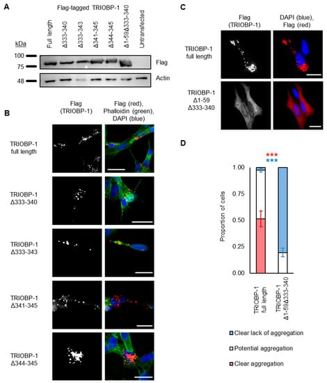 To confirm the importance of these residues for aggregation, constructs were generated encoding full-length TRIOBP-1, but with deletion of AA 333-340, 333-343, 341-345 or 344-345. Unexpectedly, all of these still formed aggregates when expressed in neuroblastoma cells (Figure 4A,B, with aggregation seen in the majority of transfected cells; quantified results in Supplementary Figure S6). This suggests that, while AA 333-340 are important for aggregation, they are not the only region of the protein involved. This was surprising, as previously constructs beginning immediately after the PH domain were shown not to aggregate once AA 324-348 were deleted [15]. Therefore, either the PH domain is involved in aggregation, or the N-terminal optionally translated region, which arises from two alternative start codons in TRIOBP-1 is responsible for it [15]. As previous data has suggested that the PH domain is unlikely to be involved in aggregation [9], we instead tried removing the 59 optionally translated amino acids from TRIOBP-1 (AA 1-59), in addition to deleting AA 333-340. Strikingly, this almost completely abolished aggregation compared to the full-length protein (Figure 4C), as could be confirmed in a blinded quantitative assay (Figure 4D). Specifically, introducing these deletions caused the number of cells with clearly visible aggregates to drop from around 50% to zero (p < 10−3, Welch’s t-test), while the number of cells with no sign of aggregation rose from less than 5% to around 80% (p < 10−8, Welch’s t-test). Other cells displayed TRIOBP1–1 structures that may or may not be aggregates.