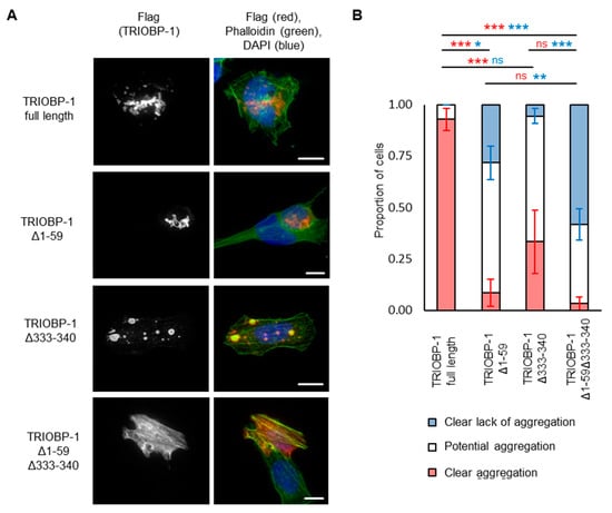 Both the extreme N-terminus and the central sections of TRIOBP-1 are involved in its aggregation, as shown through over-expression in neuroblastoma cells. (A) Full-length TRIOBP-1 lacking either the N-terminal 59 amino acid optionally translated domain or amino acids 333-340 show some signs of aggregation, while a double mutant lacking both does not. (B) Quantification of aggregation of these constructs in a blinded assay. Full length: n = 55 and Δ1-59: n = 57, Δ333-340: n = 30 (consistently low transfection rate), Δ1-59Δ333-340: n = 57. For both clear aggregation (red) and clear lack of aggregation (blue): * ptukey < 0.05, ** ptukey < 0.01, *** ptukey < 0.001, ns: not significant. All images show Flag-tagged proteins are expressed in SH-SY5Y cells (except where noted) and images are typical of 3 independent experiments. The scale bars represent 10 μm.