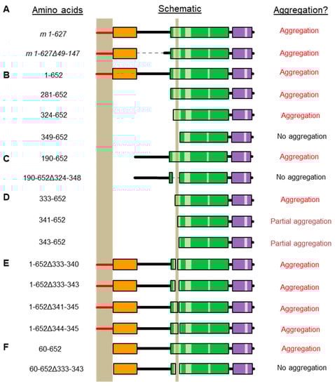 When TRIOBP-1 was first found to aggregate in mental illness, bioinformatic analyses were performed to predict whether certain regions of the protein may have the propensity to induce aggregation. This implicated the PH domain, although deletion of this region did not affect aggregation of mouse TRIOBP-1 [9] (Figure 6A). Subsequent studies involved expressing only the C-terminal half of the protein, consisting of most of the coiled-coil domains, but lacking the first coiled-coil and/or the loop between the first two coiled-coils. These experiments confirmed that this loop, mapped down to 25 amino acids (AA 324-348), was critical for aggregation [15] (Figure 6B). Crucially, a longer construct incorporating the unstructured “mid-region” of TRIOBP-1 and the first coiled-coil, but lacking these 25 amino acids, still did not form aggregates [15] (Figure 6C). Here we began by also using C-terminal fragments of TRIOBP-1 including only a portion of the 25 amino acid-long loop between the first two coiled-coils, allowing us to narrow down the likely aggregation domain to just 8 amino acids (AA 333-340, Figure 6D). We, therefore, anticipated that when these amino acids were deleted from otherwise full-length TRIOBP-1, the aggregation propensity of the process would be abolished, as was seen with a longer construct previously (Figure 6C). Surprisingly, however, knocking out of these 8 amino acids, or other portions of the loop, had no obvious effect on TRIOBP-1 aggregation (Figure 6E), indicating that the optionally translated N-terminal region of TRIOBP-1 may also be able to induce aggregation. This was confirmed by the deletion of both the N-terminal untranslated region (AA 1-59) and the 8 amino acids from between coiled-coils 1 and (AA 333-340), which together abolished aggregation (Figure 6F). It is therefore apparent that either of these regions alone is capable of inducing aggregation of TRIOBP-1. However, based on assays knocking out one or both sites, it is clear that aggregation occurs most consistently when both sites are present in the protein.