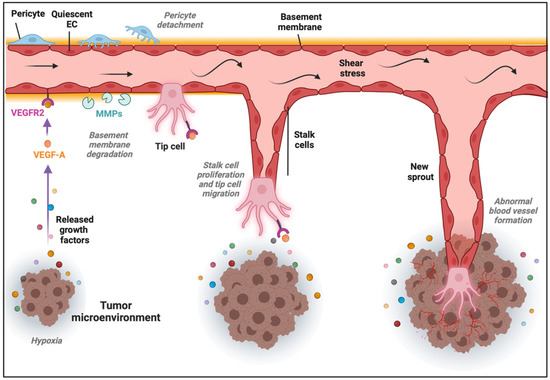 Although solid tumor initiation does not rely on the formation of new blood vessels from the existing vascular bed (named angiogenesis), once the tumor is bigger than a few millimeters, it requires the formation of new blood vessels to ensure the supply of oxygen and nutrients, as well as to evacuate metabolic waste and carbon dioxide [2]. For several decades, sustained angiogenesis has been considered one of the hallmarks of cancer, as an excessive amount of proangiogenic stimuli in the TME maintains the “angiogenic switch” [22]. However, sprouting angiogenesis (SA) within tumors often results in nonproductive angiogenesis with abnormal blood vessels in structure and function [23]. In contrast to physiological conditions, in which the vasculature of the tissue efficiently supports blood distribution and transport from arteries to arterioles, and thereafter to capillaries, postcapillary venules, and veins, in tumors, there is a chaotic and nonhierarchical vasculature [4]. It is composed of abnormally dilated, tortuous, hyperpermeable, and hypoperfused vessels that lack proper perivascular coverage and tight EC junctions [24]. Thus, the presence of not fully functional vessels stimulates even more the production of proangiogenic factors (i.e., vascular endothelial growth factor (VEGF), fibroblast growth factor (FGF), placental growth factor (PlGF), angiopoietins, among others), consequently triggering a continuous self-reinforcing loop of nonproductive angiogenesis (reviewed by Cantelmo et al. [4] and Eelen et al. [23]).