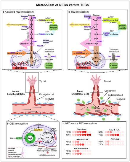 Metabolism of normal and tumor ECs. Graphical visualization of a normal and a tumor blood vessel with their metabolism. Normal vessels are characterized by a tightly adherent monolayer of ECs, intact basement membrane and rich pericyte coverage. Tumor vessels are lined by disorganized and structurally abnormal ECs and have a disturbed basement membrane with poor pericyte coverage, which leads to perturbed blood flow (shear stress) and allows cancer cells to enter the bloodstream. (a) Schematic representation of the main metabolic pathways in activated normal ECs (NECs). NECs are characterized by a high glycolytic flux, and use the oxidative pentose phosphate pathway (oxPPP), serine synthesis pathway and glutamine metabolism for nucleotide and biomass production. Acetyl-CoA derived from fatty acid oxidation (FAO) contributes to sustaining the TCA cycle (in conjunction with anaplerotic substrates) for deoxynucleotide (dNTP) synthesis during stalk cell proliferation. NECs retain functional mitochondria and OXPHOS, though minimally for ATP synthesis; instead, mitochondrial complex III is essential for EC proliferation and is critical for the maintenance of the NAD+/NADH ratio. In lymphatic ECs (LECs), the ketone-body oxidation pathway (KBO) generates acetyl-CoA which enters the tricarboxylic acid (TCA) cycle. (b) Quiescent ECs (QECs) display a lower rate of glycolysis, OXPHOS, fatty acid and nucleotide synthesis, and serine metabolism. They however increase FAO and oxPPP levels to regenerate NAPDH in order to maintain redox homeostasis and vascular barrier integrity. (c) Tumor ECs (TECs) are hyperglycolytic and have increased activity of the oxPPP, serine synthesis pathway, glutamine metabolism and FAO to sustain TEC proliferation. TECs can use glycogen as an alternative energy source and survive in nutrient-deprivation environments. In the figure, the arrow thickness represents the activity of the different metabolic pathways. (d) Activity of the selected pathways in activated NECs compared to TECs. Color code: the deeper the red, the higher the activity level of the metabolic pathway. Abbreviations: NEC, normal endothelial cell; GP, glycogen phosphorylase; HK2, hexokinase-2; G6P, glucose-6-phosphate; F6P, fructose 6-phosphate; F2,6BP, fructose 2,6-bisphosphate; PFKFB3, phosphofructokinase-2/fructose-2,6-bisphosphatase 3; G3P, glycerate 3-phosphate; 3PG, 3-phosphoglycerate; PEP, phosphoenolpyruvate; PKM2, pyruvate kinase M2; Pyr, pyruvate; G6PDH, glucose-6-phosphate dehydrogenase; R5P, ribose-5-phosphate; oxPPP, oxidative pentose phosphate pathway; PHGDH, phosphoglycerate dehydrogenase; Ser, serine; SSP, serine synthesis pathway; PSAT1, phosphoserine aminotransferase; KBO, ketone-body oxidation pathway; OXCT1, 3-oxoacid CoA-transferase 1; Gln, glutamine; GLS, glutaminase; Glu, glutamate; Asn, asparagine; ASNS, asparagine synthetase; FA, fatty acid; CPT1A, carnitine palmitoyltransferase 1A; FAO, fatty acid oxidation; TCA, tricarboxylic acid cycle; OXPHOS, oxidative phosphorylation; QEC, quiescent endothelial cell; TEC, tumor endothelial cell.