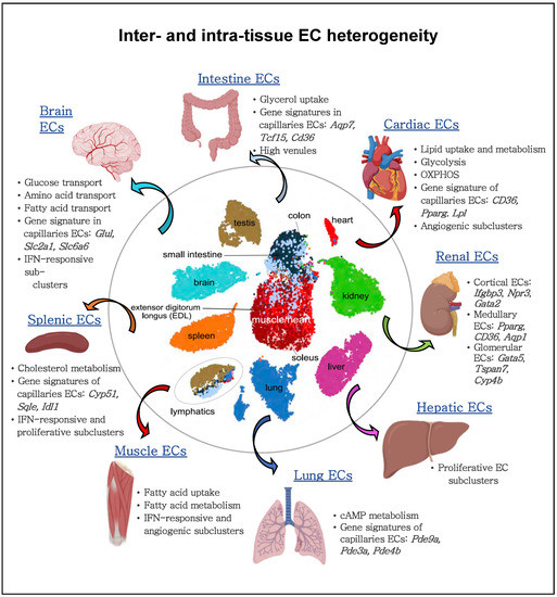 Recent studies highlighted EC heterogeneity at the single-cell level [105], including metabolic gene signature [34,36,37,105,106,107,108]. A murine single cell atlas from 11 healthy tissues unveiled the heterogeneity of ECs with specification per tissue type and identified heterogeneous metabolic gene patterns in ECs between tissues and between vascular beds (Figure 3) [105]. For instance, capillary ECs were found to upregulate genes involved in uptake and metabolism of glycerol and FAs. Also, an unbiased approach revealed that distinct metabolic genes were upregulated in ECs from different tissues and codetermined the tissue-grouping phenomenon of ECs. For example, spleen ECs upregulated cholesterol metabolism genes in line with the spleen’s suggested role in plasma cholesterol regulation, and cardiac and muscle ECs expressed higher levels of genes involved in FA uptake and metabolism (Figure 3) [105].