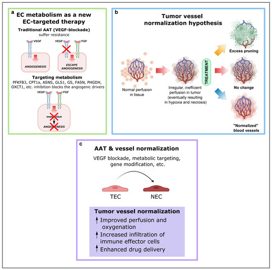 EC metabolism as a new EC-targeted therapy approach, tumor vessel normalization and alternative improved AAT in combination with other antitumor drugs. (a) Targeting EC metabolism as an alternative method to block pathological angiogenesis. While current anti-VEGF therapy compensatorily induces other angiogenic drivers (alternative growth factors), targeting EC metabolism, an engine driving angiogenesis, impairs vessel growth, regardless of how many angiogenic signals are present. Reproduced from [1] using BioRender.com. (b) Depending on the type and intensity of antiangiogenic therapy (AAT), the tumor vasculature can be pruned, leading to decreased blood perfusion (top); not respond to therapy (center); or become “normalized,” resulting in increased blood perfusion (bottom). Reproduced from Sorensen et al. [120] using BioRender.com. (c) Consequences and effects of AAT and vessel normalization. Abbreviations: EC, endothelial cell; VEGF, vascular endothelial growth factor; PFKFB3, phosphofructokinase-2/fructose-2,6-bisphosphatase 3; CPT1A, carnitine palmitoyltransferase 1A; ASNS, asparagine synthetase; GLS1, glutaminase; GS, glutamine synthase; FASN, fatty acid synthase; PHGDH, phosphoglycerate dehydrogenase; OXCT1, 3-oxoacid CoA-transferase 1; AAT, antiangiogenic therapies; TEC, tumor endothelial cell.