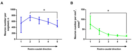 The number of GFP-expressing neurons per segment of the 320 μm long dorsal striatum in the rostro-caudal direction changes in such a way that the number of neurons in the second rostral segment is significantly greater than in the most caudal fifth segment (Figure 2A). As for the distribution density of GFP-expressing neurons (number of neurons per mm2), this parameter was higher in the rostral part of the dorsal striatum than in the caudal one (Figure 2B).