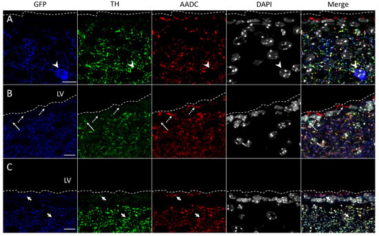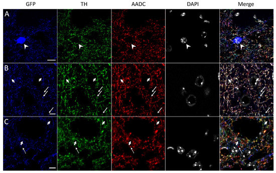 Confocal microscopy of the dorsal striatum of transgenic mice. (A) Neuron cell body containing green fluorescent protein (GFP, blue) and stained for 4′,6-diamidino-2-phenylindole (gray) (DAPI) but immunonegative for tyrosine hydroxylase (TH, green) and aromatic L-amino acid decarboxylase (AADC, red) (arrowhead). (B) Nerve fibers stained for GFP (blue), TH (green), and AADC (red) (short arrow), or for GFP and TH (long arrow). (C) Nerve fibers stained for GFP (blue), TH (green), and AADC (red) (short arrow), or for AADC (dotted arrow). Scale bars: 10 µm for (A); 5 µm for (B,C).