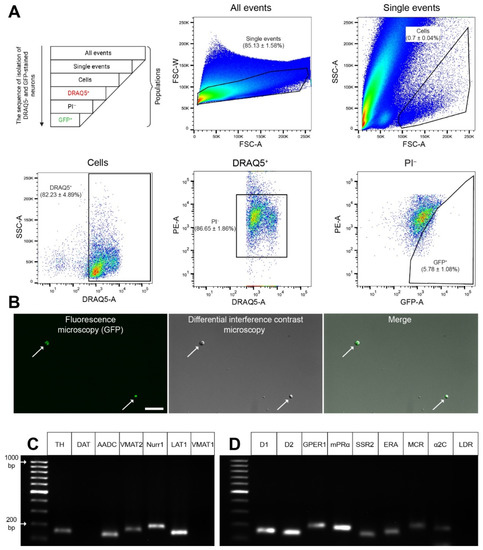 Complementary DNA was synthesized from 100 ng total RNA using the Maxima H Minus First Strand cDNA Synthesis Kit (Thermo Fisher Scientific, Waltham, MA, USA) according to the manufacturer’s protocol. Complementary DNA concentration was measured using a NanoDrop 8000 spectrophotometer. PCR was performed using qPCRmix-HS SYBR+LowROX (Evrogen, Moscow, Russia) on a QuantStudio 12k Flex cycler (Applied Biosystems, MA, USA). In sorted cells, we assessed by PCR the expression of the following genes for neuronal dopaminergic phenotype proteins: TH, DAT, AADC, VMAT2, and nuclear receptor-related 1; genes for transporters: LAT1 and VMAT1. In addition, expression of the following receptors was assessed by PCR: alpha-2C adrenoceptor, DA receptor 1, DA receptor 2, endothelin receptor type A, G protein-coupled estrogen receptor 1, L-DOPA receptor, membrane progesterone receptor alpha, mineralocorticosterone receptor, and somatostatin receptor 2. Oligonucleotide primers were used to determine the expression of these genes (Table S1, Evrogen, Moscow, Russia). PCR was performed using 500 ng of complementary DNA and the following amplification protocol: hold stage at 50 °C for 2 min and then at 95 °C for 10 min; PCR stage at 95 °C for 15 s and then at 60 °C for 1 min (50 cycles); melt curve stage successively at 95 °C for 15 s, at 60 °C for 1 min, and at 95 °C for 15 s. After the end of the reaction, the amplified products were separated at a voltage of 100 V in 1.5% agarose gel (Helicon, Moscow, Russia) containing ethidium bromide (Thermo Fisher Scientific, Waltham, MA, USA). DNA fragments were detected using ChemiDoc Touch (Bio-Rad Laboratories, CA, USA).