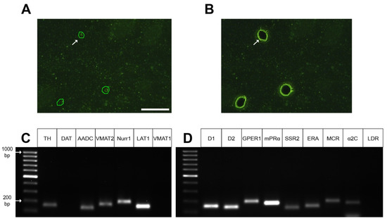 Laser microdissection of green fluorescence protein(GFP)-containing neurons from sections of the dorsal striatum of transgenic mice (A,B) followed by polymerase chain reaction analysis of the expression of genes for the dopaminergic phenotype (C) and receptors for signaling molecules (D). Scale bar: 50 µm for (A,B). Arrow shows outlines (green) of a striatal GFP neuron (A) and a hole after its laser microdissection (B). The leftmost lanes represent the DNA ladder (C,D). AADC, aromatic L-amino acid decarboxylase; α2C, alpha-2C adrenoceptor; D1, dopamine receptor 1; D2, dopamine receptor 2; DAT, dopamine transporter; ERA, endothelin receptor A; GPER1, G-protein coupled estrogen receptor 1; LAT1, L-amino acid transporter 1; LDR, L-DOPA receptor; MCR, mineralocorticosterone receptor; mPRα, membrane progesterone receptor alpha; Nurr1, nuclear receptor-related 1; SSR2, somatostatin receptor 2; TH, tyrosine hydroxylase; VMAT1, vesicular monoamine transporter 1; VMAT2, vesicular monoamine transporter 2.