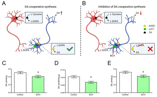 Testing the hypothesis of dopamine (DA) synthesis in transgenic mice by striatal neurons expressing one of the DA-synthesizing enzymes—tyrosine hydroxylase (TH) or aromatic L-amino acid decarboxylase (AADC). (A,B) Schematic representation of cooperative synthesis of DA by monoenzymatic neurons (A) and its inhibition by 2-aminobicyclo[2.2.1]heptane-2-carboxylic acid (BCH), an inhibitor of L-amino acid transporter 1 (LAT1) (B). (C) DA concentration in striatal sections of transgenic mice after one hour of incubation of sections in modified Krebs–Ringer solution with or without BCH. (D) DA concentration in the incubation medium after incubation of striatal sections of transgenic mice in Krebs–Ringer solution with or without BCH, normalized to the volume of the incubation medium and the protein concentration in striatal sections. (E) Total DA concentration in striatal sections of transgenic mice and the incubation medium after one hour of incubation of sections in Krebs–Ringer solution with or without BCH. * p < 0.05, significant difference (paired t-test). n = 9. Data are presented as mean ± SEM.